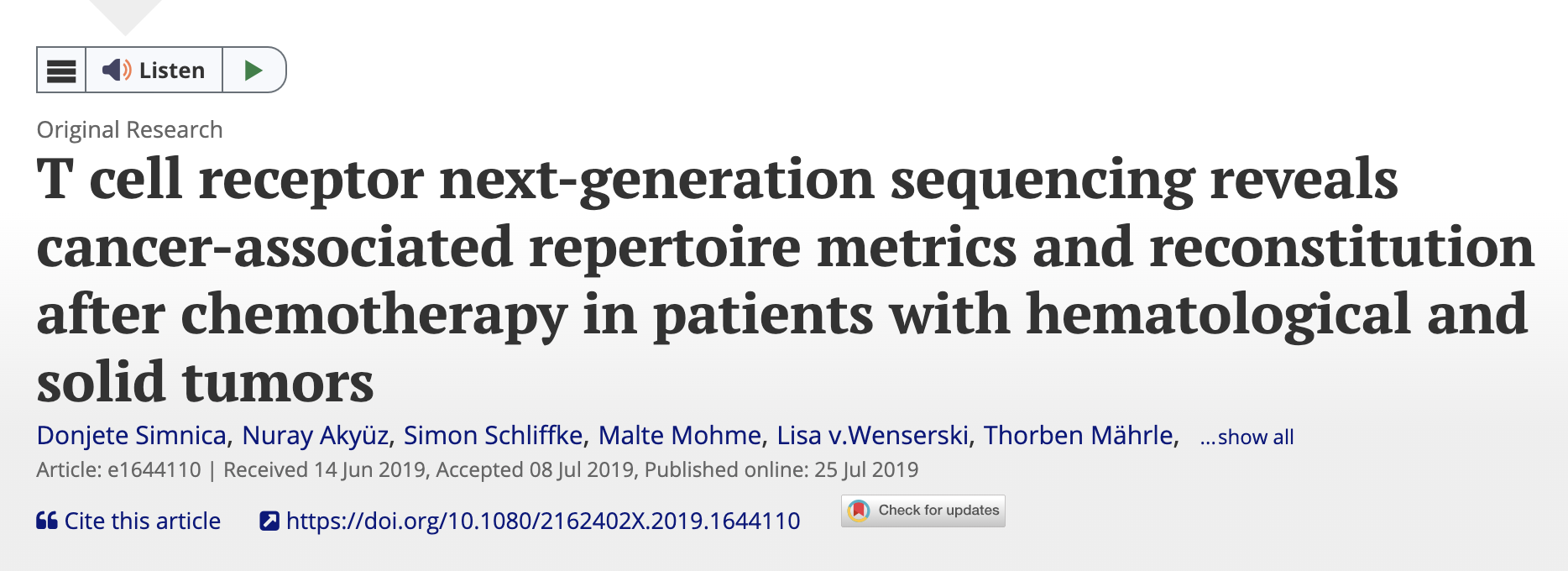 [1]T cell receptor next-generation sequencing reveals cancer-associated repertoire metrics and reconstitution after chemotherapy in patients with hematological and solid tumors.