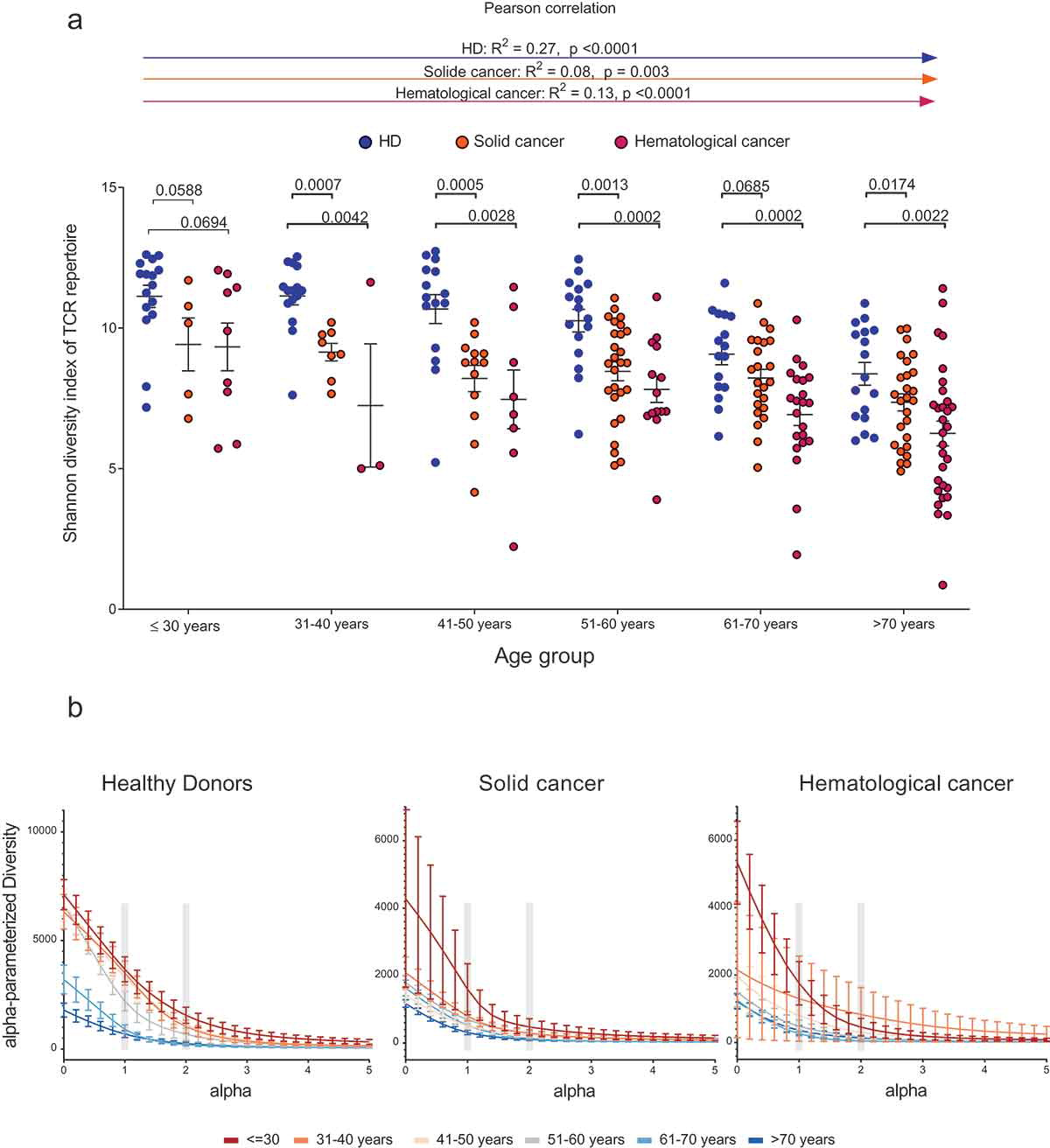 2019年,德國馬丁路德大學(xué)和德國漢堡-埃彭多夫大學(xué)研究團(tuán)隊(duì)在《Oncoimmunology》(《腫瘤免疫學(xué)》)發(fā)表了一篇題為“T cell receptor next-generation sequencing reveals cancer-associated repertoire metrics and reconstitution after chemotherapy in patients with hematological and solid tumors”(T 細(xì)胞受體的下一代測序技術(shù)揭示了血液系統(tǒng)腫瘤和實(shí)體腫瘤患者中與癌癥相關(guān)的 T 細(xì)胞受體庫特征指標(biāo),以及化療后 T 細(xì)胞受體庫的重建情況)的研究成果,他們經(jīng)過對健康人、實(shí)體瘤患者以及血液瘤患者的T細(xì)胞分析后表示:年齡的增加使人體細(xì)胞的種類越來越少,T細(xì)胞的多樣性也會逐漸減少。